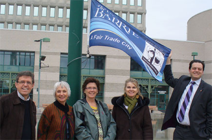 April 30th, City Hall, Barrie Mayor Jeff Lehmann assists Fair Trade Barrie with the raising of the Fair Trade Town flag to proclaim the beginning of National Fair Trade Fortnight May 1st to May 15th.